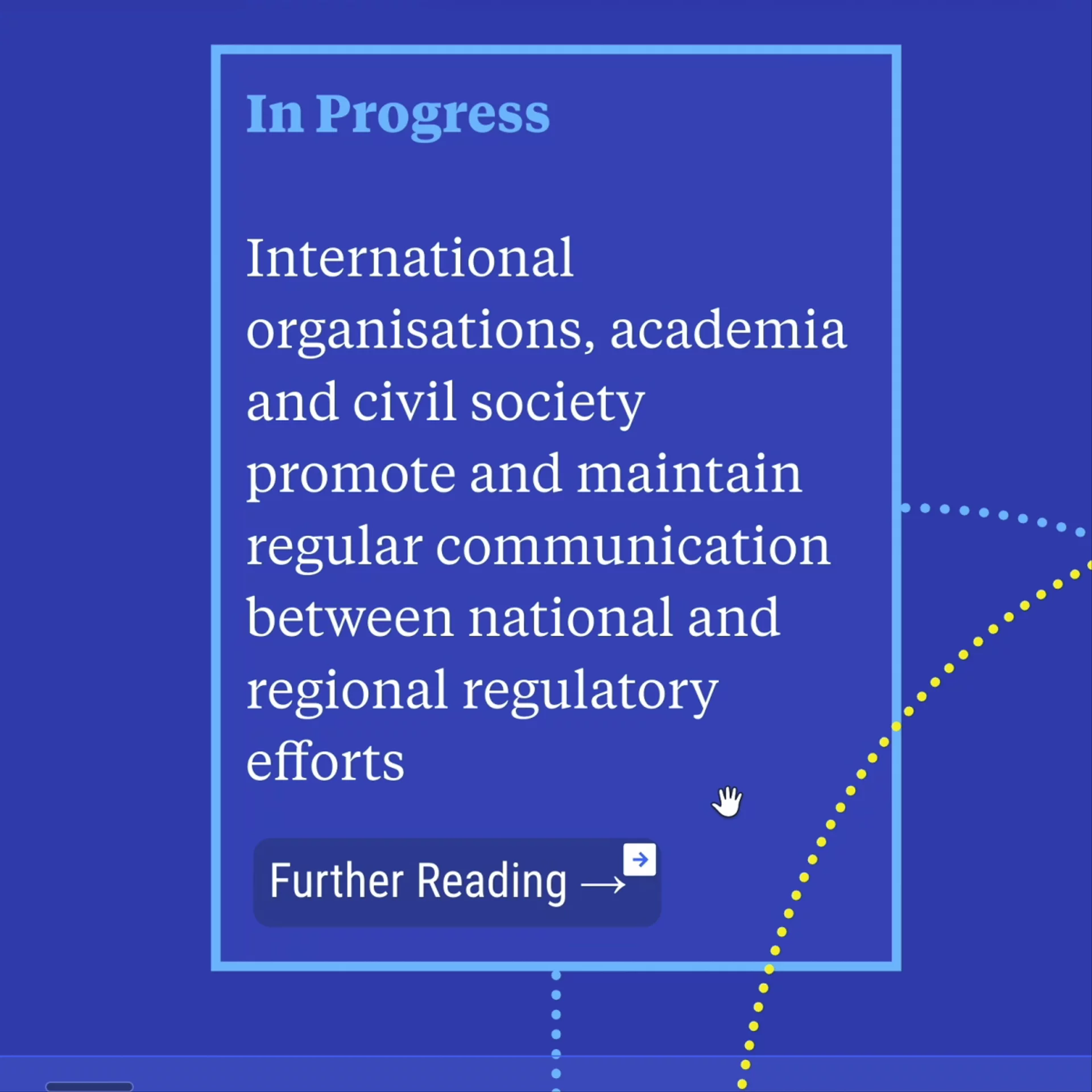 The final blueprint is a complex data visualization that diagrams several dozen actions, decision junctures, diversions, and barriers, as well as two layers of proposed governance prerequisites and further reading for all of the above. The blueprint encourages contribution by the public in two methods. Viewers of the blueprint can leave a comment directly on it, or use it as a baseline template to fork and built their own.