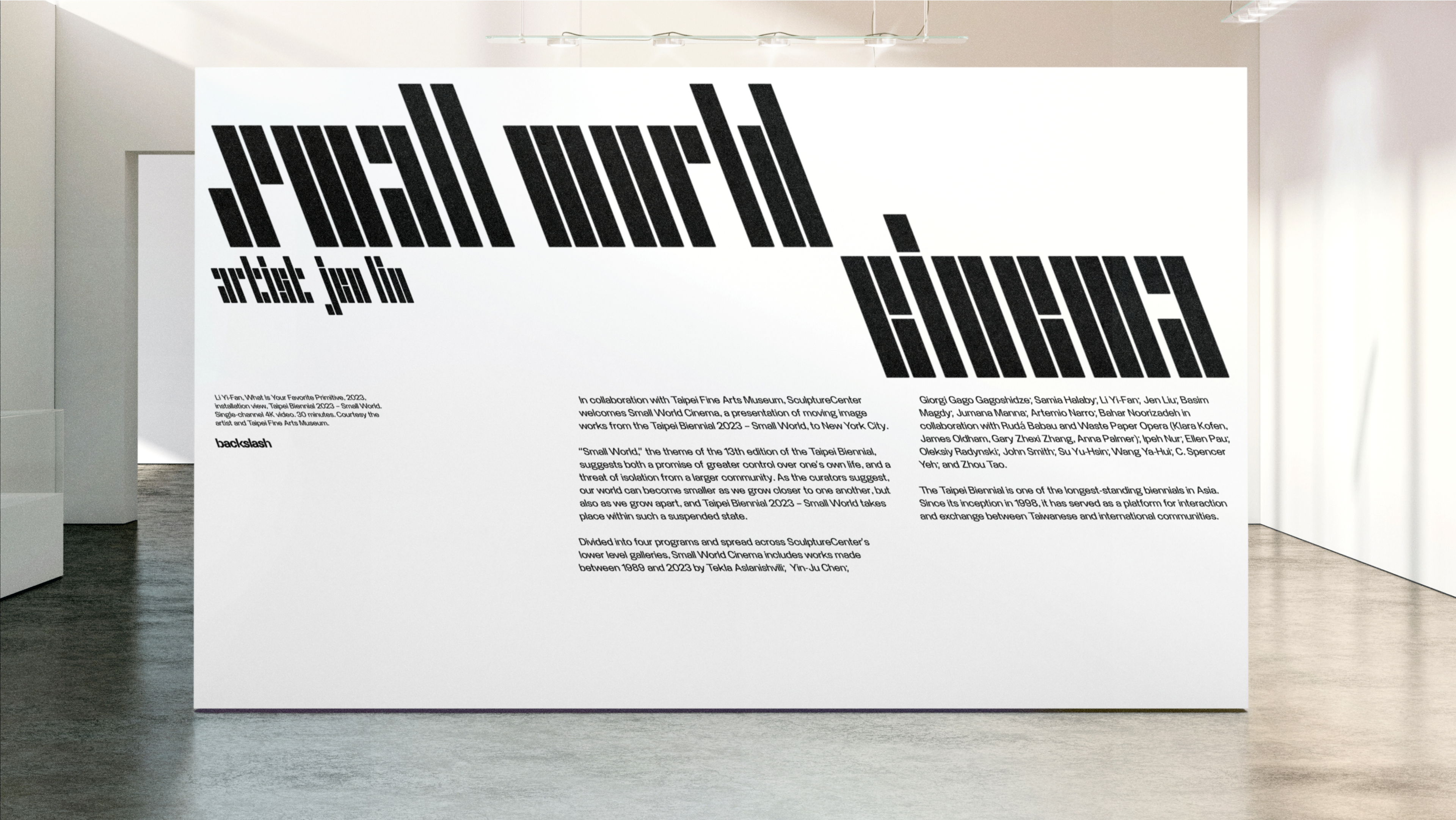 Along with the brand identity, Cotton designed and developed a new website for Backslash. The website is designed to resemble a museum exhibition wall; given the expressive nature of the typeface and brand elements, the design emphasizes whitespace, vertical layouts, and precise grids to create a balanced and visually engaging experience. The website also features a distinctive diagonal scroll in some sections, set at the signature -21° angle, reinforcing the brand’s unique identity.